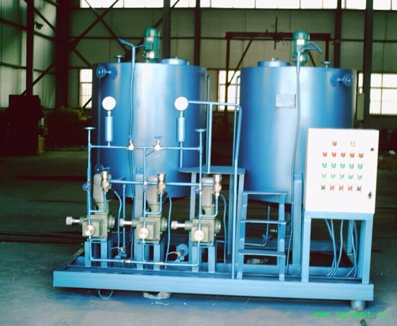 | 一、概述 本厂生产的炉内加药装置包括给水加氨,加联胺,炉水加磷酸盐,炉水加磷酸盐协调控制,凝结水加氨等系统. ??加药装置的单元组合形式主要视机组容量大小,锅炉配置的方式(二炉共用一套或单炉单套等),自动化水平的高低(自动或手动控制),加药泵种类的选用(交流或支流马达,进口或国产泵)灵活的组成各种不同形式单元,安装在一个底座上,这种工厂化的整套装置,大大减少了设计和现场安装的工作量,对整机的质量,安全和现场投运提供了可靠的保证. ??单元组合装置各部件材质,主要分为不锈钢,碳钢,和碳钢衬胶等几种形式,视用户需要而定. 二、分类 1、炉水加磷酸盐系统: ?? 磷酸盐溶液的配制系统图所示磷酸三钠直接加入溶液箱搅拌配置外,亦可单设4m3的溶解箱,经输液泵先循环搅拌后,再进入溶液箱的配制方法. ? 加磷酸盐量的控制除手工控制外,亦可进行自动控制:依据炉水磷酸根表的采样信号,经微机综合处理后的输出,控制加磷酸盐泵的量达到自动加药的目的. 2、给水、凝结水加氨系统: ? 氨液的配制除手工配制外亦可进行自动控制:当溶液箱液位低于设定值时,自动开启凝结水进口电磁阀至高液位时关闭,在溶液箱出口管道上安装的导电度仪表的测量值,控制进氨阀门开启,当浓度为±1相当于450 us/cm的导电值,自动关闭进氨阀,完成配药过程. ? 加氨量的控制除手工控制外,亦可进行自动控制:依据给水导电度(或PH值)的采样信号,经微机综合处理后的输出,控制加氨泵的加氨量达到自动加药的目的. 3、炉水磷酸盐协调控制系统: ? 在以除盐水作为补给水的高参数,大容量汽包锅炉中,既使炉水中保持合适的PH值,又防止产生游离NaOH,兼有防腐防垢功能,这**是炉水磷酸盐协调处理的目的,在保证炉水PH,PO3-符合部颁标准前提下又使炉水中无游离NaOH的水质工况是靠向汽包内添加Na3PO4+Na2HPO4或Na3PO4+NaOH的混合液来实现的.两种配方的选择主要由锅炉炉水水质决定,而配方的定量-即Na/PO4比(R值)是通过PH和PO3-的测量,查表得到的. ? 由于可靠的磷酸根和PH测量仪表,微机软件技术的开发,及性能优良的电控加药计量泵的应用,使得炉水磷酸盐协调处理成为可能,并彻底解决了传统磷酸盐处理存在的主要问题. ? 三、系统组成: 如图所示是按照两桶三泵的一套加药装置.