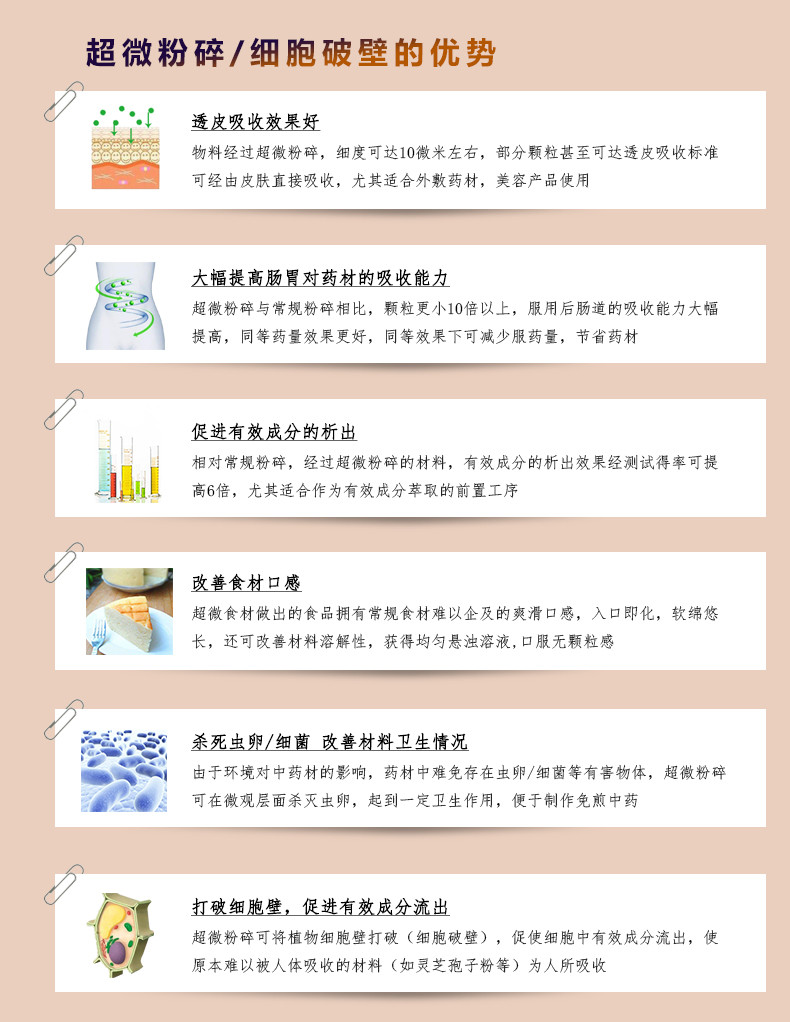 我公司生产的“百顺达”牌“BW”系列超微粉碎设备具有智能化控制.超微粉碎产量大、细胞破壁率高、超低温粉碎.全密闭无损耗.无粉尘溢出.高糖高油高纤维作业等优良突出的特点。超微粉碎的粉体粒径可达1~0.1μm,细胞破壁(膜)率达98%以上