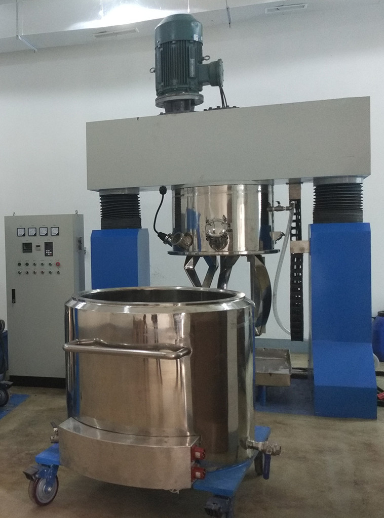 行星搅拌机是一种行星运动、效率高、无死点的均质搅拌设备。行星搅拌机的桨叶在绕料缸 轴线整体公转的同时,又以不同的转速绕自身轴线自转,使物料在料缸内作复杂的运动,从而迅速获得均质搅拌的效果。行星搅拌机适用于食品或化学工业所需的多组份固-固相、固-液相、液-液相物料的均质搅拌、聚合反应、硫化、磺化、分散、溶解、调质等工艺过程。行星搅拌机主要是用于生产10,000CP6,000,000CP膏状物料,如洁面乳、牙膏、焊锡膏、润滑脂、油墨、油漆、颜料、锂电池、玻璃胶、聚氨酯密封胶等高粘度物料。