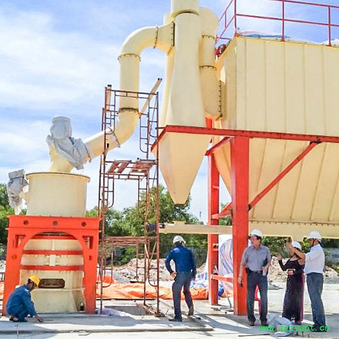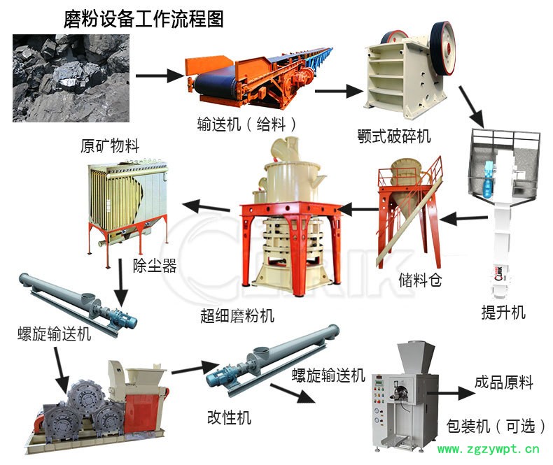 HGM90超细磨粉机生产线通常有锤式破碎机、斗式提升机、储料仓、震动给料机、微粉磨主机、变频分级机、双联旋风集粉器、脉冲除尘系统、高压风机、空气压缩机、电器控制系统等组成。
