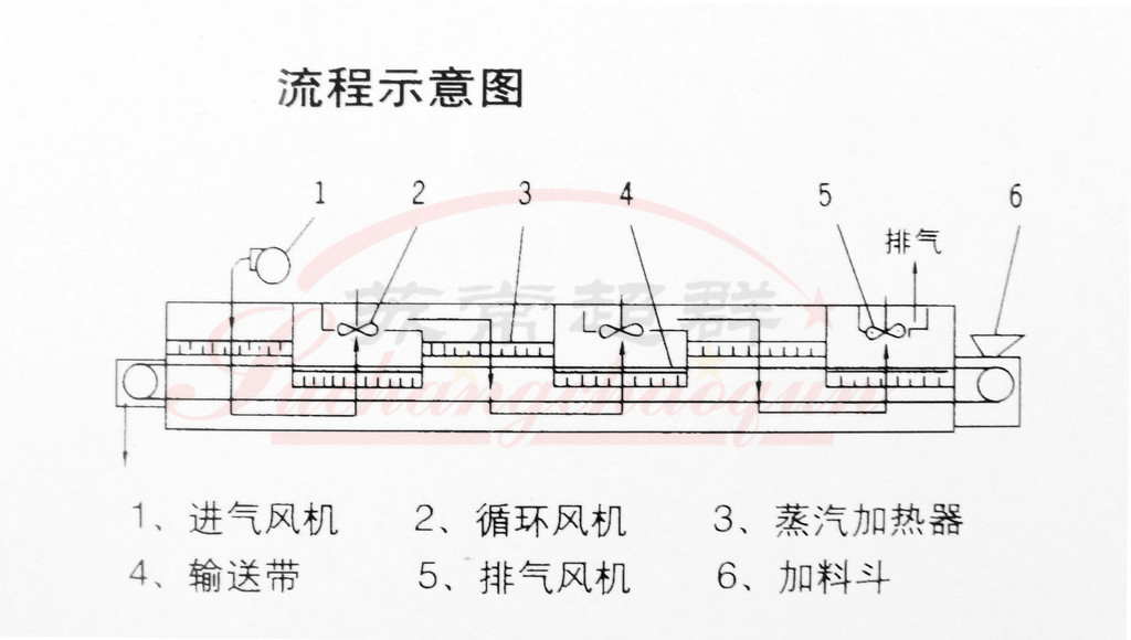 物料由加料器均匀地铺在网带上,网带一般采用12-60目不锈钢丝网,由传动装置拖动在干燥机内移动。干燥机由若干单元组成,每一单元热风独立循环,部分尾气由专门排湿风机排出,废气由调节阀控制,热气由下往上或由上往下穿过铺满物料的网带完成热量与质量传递的进程,带走物料水份。网带缓慢移动,运行速度可根据物料温度自由调节,干燥后的成品连续落入收料器中。上下循环单元根据用户需要可灵活配备,单元数量亦可根据需要选取。