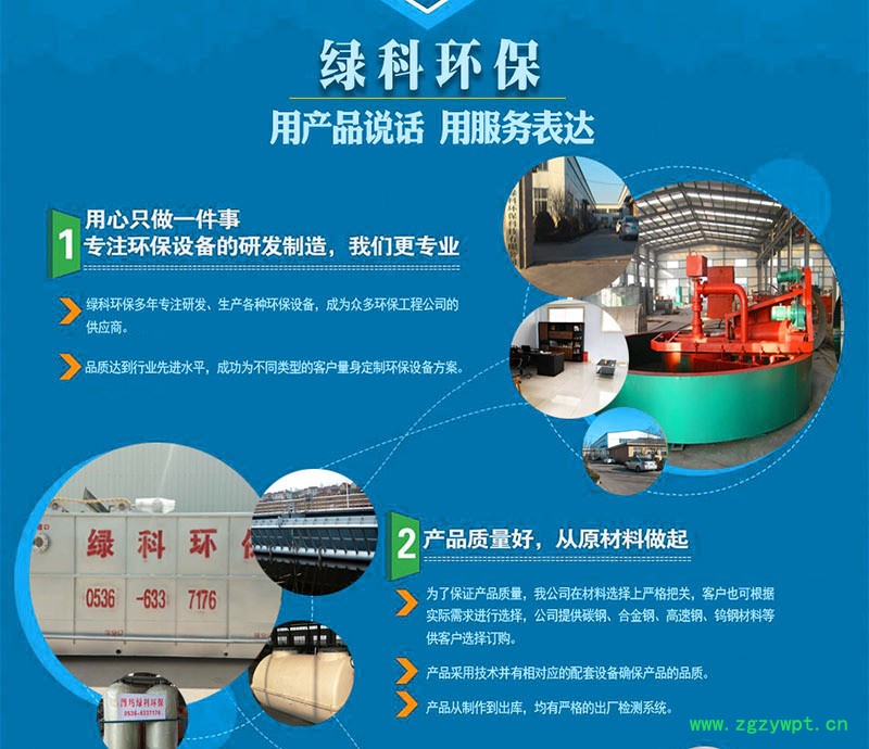 潍坊市绿科环保科技有限公司是一家集自主研发设计、生产制造销售、技术服务于一体的新型技术企业,主要以污水处理、固液分离、垃圾焚烧、大气治理等环保设备的制造销售,环境工程设计,施工安装及配套设备生产销售为主,公司的主营产品有医疗污水处理设备、乡镇污水处理设备、农村污水处理设备、MBR污水处理设备、一体化污水处理设备、塑料清洗污水处理设备、油墨印刷污水处理设备、养猪污水处理设备、气浮机、污泥脱水设备、厌氧好氧生化设备、酒厂污水处理设备、豆制品污水处理设备、环保设备配件。