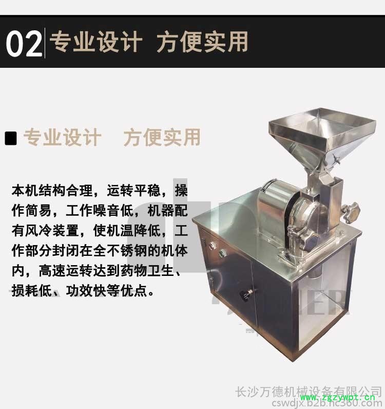 本机结构简单、坚固、运转平稳、粉碎效果良好,被粉碎物可直接由主机磨腔中排出、粒度大小通过更换不同孔径的网筛获得,另外该机为全不锈钢。机壳内壁全部经机加工达到表面平滑,改变了以前机型内壁粗糙、积粉的现象,使药品、食品、化工等生产更符合国家标准,达到GMP的要求。