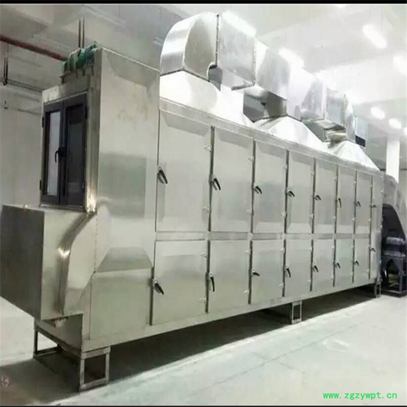 物料由加料器均匀地铺在网带上,网带一般采用12-60目不锈钢丝网,由传动装置拖动在干燥机内移动。干燥机由若干单元组成,每一单元热风独立循环,部分尾气由专门排湿风机排出,废气由调节阀控制,热气由下往上或由上往下穿过铺满物料的网带完成热量与质量传递的进程,带走物料水份。网带缓慢移动,运行速度可根据物料温度自由调节,干燥后的成品连续落入收料器中。上下循环单元根据用户需要可灵活配备,单元数量亦可根据需要选取。