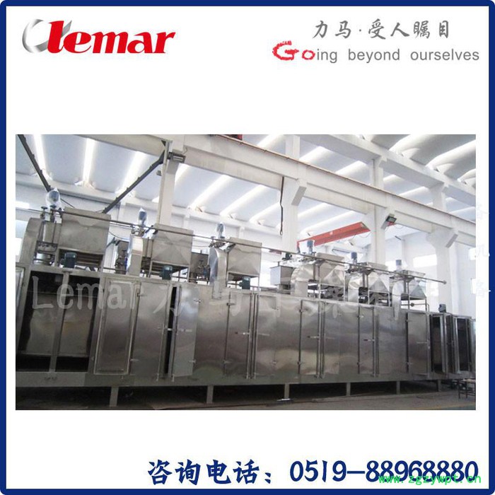 将所要处理的物料通过适当的加料机构(如星型布料器、摆动带、粉碎机或造粒机),分布在输送带上,输送带通过一个或几个加热单元组成的通道,每个加热单元均配有空气加热和循环系统,每一个通道有一个或几个排湿系统,在输送带通过时,热空气从上往下或从下往上通过输送带上的物料,从而使物料能均匀干燥。
