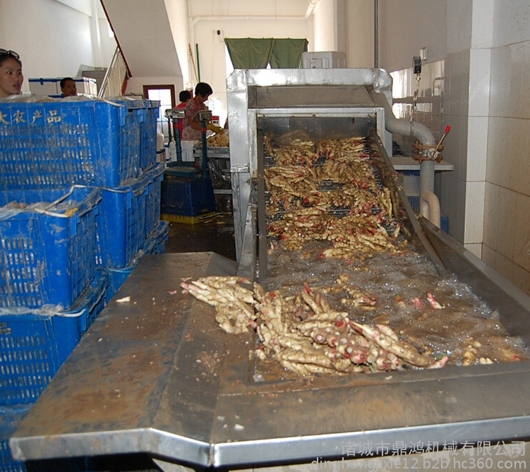 大姜先进入高压喷淋水槽,在高压喷淋水流下大姜被充分打散、翻滚、清洗、滚杠传送,从物料表面洗脱的泥沙沉入底部隔离仓,不会发生回流造成二次污染。大姜进入气泡清洗装置,漂浮在水中的杂物、小虫通过去杂机构清理掉,洗净的大姜由出水口再经喷淋清洗送至下道工序。该清洗机能有效去除大姜表面的污染物、农药,且对大姜损伤很小。有效的清除蔬菜表面的污染物而且可以缩短清洗时间,省时、省力、省水、洗洁净高、提高生产效率。