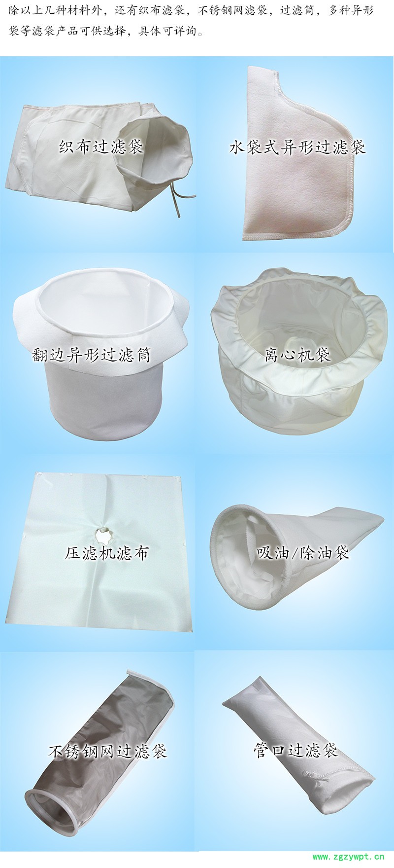 我厂的过滤产品分为大系列。包括水预处理及后处理当中使用的水过滤袋,河水过滤袋,润滑油生产灌装用的润滑油过滤袋、灌装过滤袋,防冻液过滤袋,气油柴油过滤用的油过滤袋,阳极袋,喷涂电泳漆过滤袋,除油吸油袋,水袋式过滤袋,食品饮料过滤袋,模具制造机械加工中使用的切削油液过滤袋,大型带加强筋过滤袋等固体液体分离过滤袋,三足式或吊袋式离心机使用的离心机袋,离心机包(SS400-SS1500型),风机除尘袋,空气过滤器,板框压滤机滤布,抽滤器滤袋(适用于各类抽滤器),翻边过滤袋(可方便压于设备进料口),过滤筒,不锈钢过滤器,耐腐蚀过滤器,多袋大流量液体过滤器,PP PE针刺毡过滤布,尼龙锦纶单丝过滤网及高强度织布等过滤材料。并可根据客户的实际使用情况生产加工定做。只要您需要液体或空气过滤,只要我们有相应的材料,肯定会有一款产品适合您。