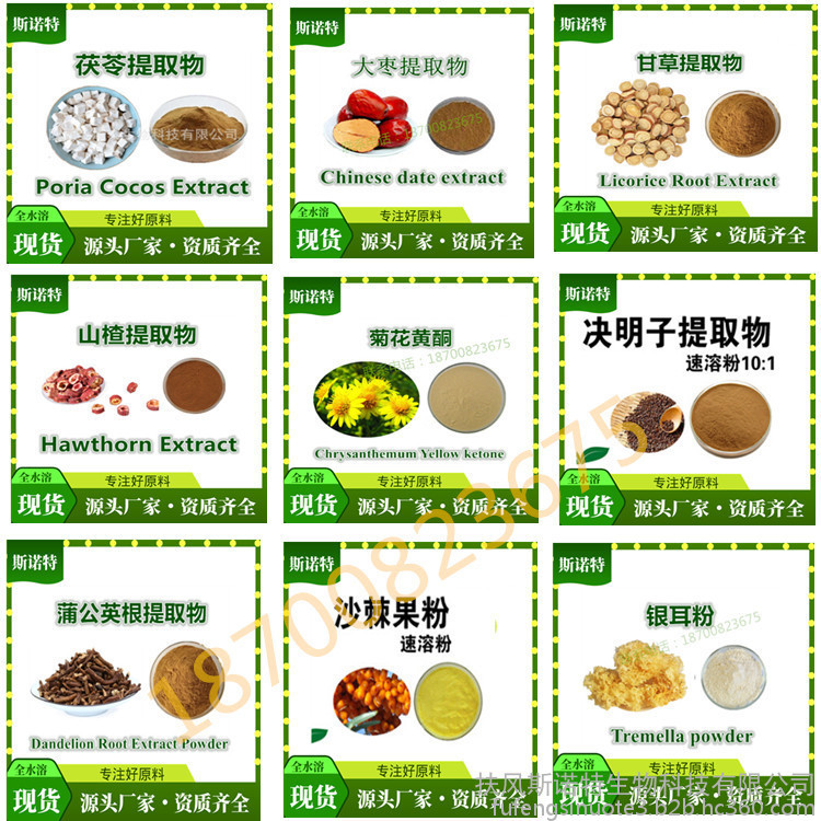 真菌提取物:灵芝提取物、云芝提取物、猴头菇提取物、姬松茸提取物、香菇提取物、灰树花提取物、桑黄提取物、樟芝提取物、虫草提取物、金针菇提取物、银耳提取物、平菇提取物、茶树菇提取物、竹叶黄酮、竹叶多糖等。