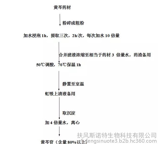 黄芩素提取来源:唇形科植物高黄芩(Scutellaria altissima L.)全草,主要是根部;并头草S.Scrodiifolia Fisch.(S.galericulata L.)的叶和根;紫葳科植物木蝴蝶Oroxylum indicum (L.) Vent.的种子和茎皮;车前科植物大车前Plantago majorL.的叶。