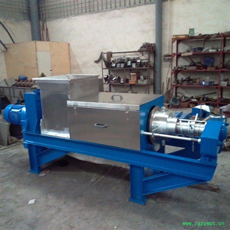 本双螺旋式压榨机工作过程是:输送螺旋将进入料箱的物料推向压榨螺旋,通过压榨螺旋的螺距减小和轴径增大,并在筛壁和锥形体阻力的作用下,使物料所含的液体物(果汁)被挤压出.挤出的液体从筛孔中流出,集中在接汁斗内.压榨后的果渣,经筛筒末端与锥形体之间排出机外,锥形体后部装有弹簧,通过调节弹簧的预紧力和位置,可改变排阻力和出渣口的大小,用来调节压榨的干湿程度. 5、10、20吨/时压榨机为双螺旋转,旋转方向相反,对物料的压榨力大而均匀,出渣口锥形体由液压缸控制,调节油压可改变对物料的施压效果,调整出汁率,本机还可用于其它物料的固液分离,其效果因物料品质不同有一定的差别。本机的进料箱和筛筒及螺旋均采用**耐酸碱304不锈钢材料制造。