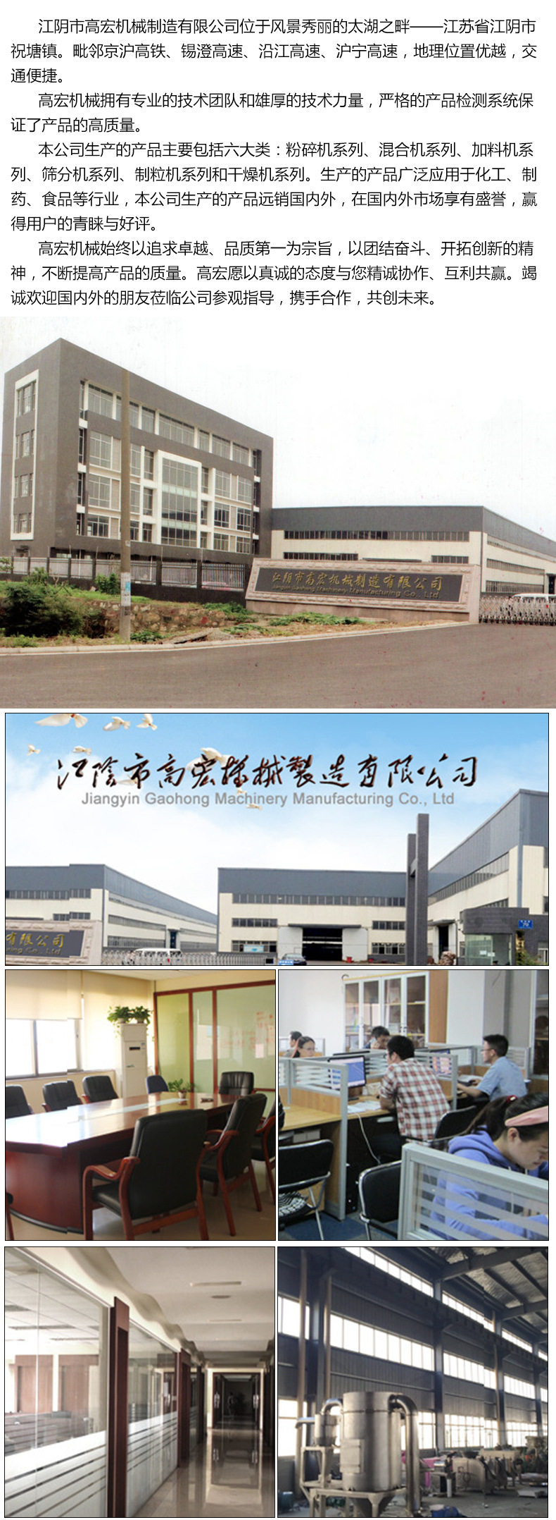 江阴高宏生产的WFJ-15/30/60型超微粉碎机组主要适合于粉碎细度在80-400目、产量较大的粉碎需求,非常适合药厂、食品厂、化工厂的高精度粉碎要求,粉碎细度可随意调节。该粉碎机组主要由主机、辅机、电控箱三个部分组成,设计紧凑,结构合理,属风选式、无筛网。超微粉碎机组整机都由**不锈钢生产制造而成。机内装有分级机构,能使粉碎、分级一次完成。负压输送使粉碎作业时机腔内产生的热量源源不断地排出,故也适应于热敏性物料的粉碎。本机适用范围广,生产过程连续进行,出料粒度可调。