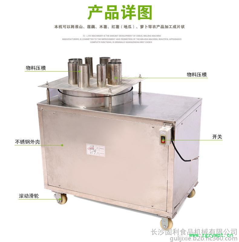 入 料:将木质压模取出,调整好切片厚度,开启机械后,将物料放入进料口中即可