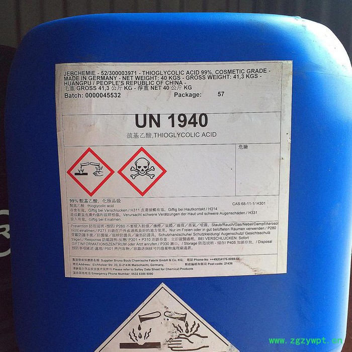 1.用于制作环氧树脂,双酚A的催化剂,是日用化妆品冷烫精及脱毛剂的主要原料,也可用作合成PVC透明塑料和有机锑,有机锡的热稳定剂的基础原料。其试剂产品是检验铁,钼,银,锡等金属离子的灵敏试剂。选矿上为硫化铜及硫化铁矿物的抑制剂。在石油化学工业和铁路部门,用于设备及铁轨的清洗除锈。 2.其铵盐和钠盐主要用作卷发剂、钙盐可用做脱毛剂、聚氯乙烯低毒或无毒稳定剂、聚合反应的引发剂、加速剂及链转移剂、金属表面处理剂。此外,巯基乙酸是检定铁、钼、铝、锡等的敏感试剂;也可作为聚丙烯加工成型时的结晶成核剂以及涂料、纤维的改性剂、毛毯速理剂。聚氯乙烯、橡胶的稳定剂原料、冷烫发用药剂、医药中间体。 3.用作光度法测定钼、铼和铁等的显色剂,并用作配合掩蔽剂。其盐还用于配制卷发冷烫剂和脱毛剂。 4.脱毛剂。巯基乙酸盐在较强碱性下,涂在皮肤上能进行快速脱毛。巯基乙酸可用于美容、临床手术前及动物实验时的脱毛**的是巯基乙酸的钙盐**pH值为11.5**有效含量为:5%巯基乙酸,7%钙盐。 5.金属表面处理剂。添加极少量的巯基乙酸即能改进金属清洗剂和浸渍液的清洗效果,并能抑制被处理金属表面的腐蚀,故常用于金属的精密加工中的防锈剂。这种效果在很广泛的ph值范围内均很显著。含巯基乙酸的多组分清洗-防锈液可用于汽车冷却系统的清洗,pH值为10.6。巯基乙酸的十六烷基酯可抛光或清洗银制品,不会使银器表面失去光泽。 6.聚氯乙烯低毒或无毒稳定剂。巯基乙酸辛锡酸、甲锡酯、辛酯、2-乙基己酯、甲氧基丁酯、乙氧基乙酯等具有低毒与无毒性,经美国食品与药物管理局批准,上述酯类可作为低毒无毒稳定剂。可用于聚氯乙烯上水管道、水泵等产品的加工,食品包装,食品加工厂的设备管道,亦可用于化妆品厂及制药厂,且这类稳定剂使产品透明性和热稳定性均有提高。此外,本品是检定铁、钼、铅、锡等的敏感试剂。还可用作纤维改性剂、毛毯整理剂。 7.用作测定铁的试剂及稳定剂,用于药水、烫发水制造等。 8.作为石油勘探缓蚀剂。巯基乙酸可以一种可作为嗅盐完井液的优良缓蚀剂,在石油勘探钻探高压井时,为了保护油气层,减少对地层的伤害,需使用溴化物的无固相完井液,这些盐的浓溶液具有很强的腐蚀性,并且随温度的升高腐蚀性加剧。在高温下抑制盐水腐蚀的缓蚀剂只有含硫化合物,巯基乙酸盐在一定温度下与金属发生化学反应,形成一层致密的FeS保护膜,起到了缓蚀作用。