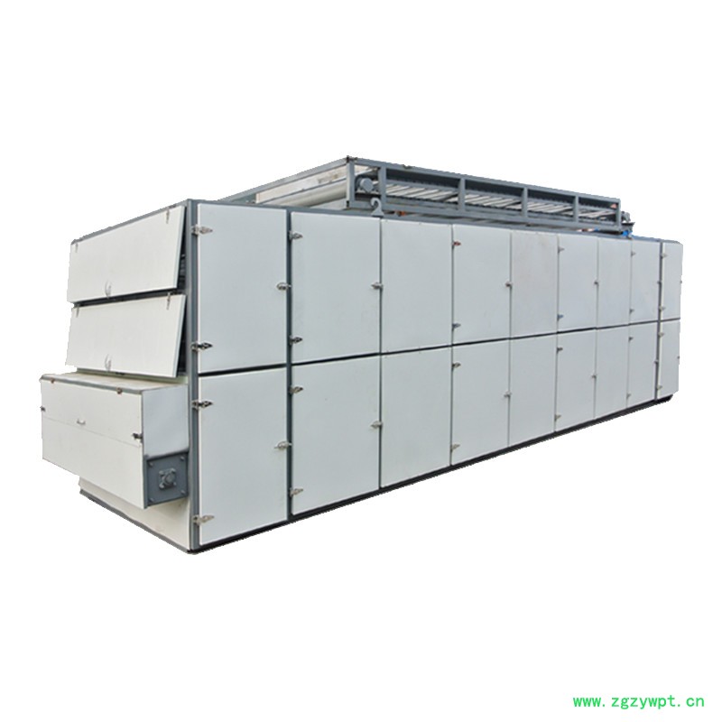 质量好中药材烘干从上层进入,中药材铺料厚度由自动铺料器控制,在网带的带动下,中药材从上层往下层移动。运行中,中药材有多次往下落的过程,使中药材翻动更彻底、干燥更均匀。干燥好的中药材从底层的出料口排出,在此过程中充分和高温热空气充分接触,达到干燥的效果。