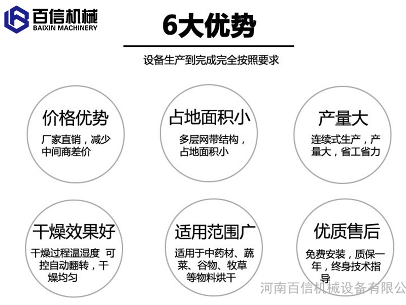 百信多层连续式麦冬烘干机脱水干燥迅速, 操作方便,效率运行。能满足大批量连续生产的需求,网带式干燥设备广泛应用于食品(如面条、面皮)、干果(大枣、巴旦木、腰果、开心果)、花茶(玫瑰花、红薯、金银花、山楂花)、农副产品(如玉米、红薯烘干袪潮)、脱水蔬菜(如大蒜、红薯、红薯、辣根、洋葱、白菜干、生姜、小香葱、辣根、菠菜)、瓜果(如红薯、薯片、红薯、葡萄干、哈密瓜)、中草药、(连翘、黄蜀葵、枸杞、)水产品、土特产品、饲料及化工原料等加工之片状、条状、块状和颗粒状物料的脱水干燥作业。