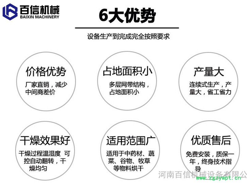 百信多层连续式烘干机脱水干燥迅速, 操作方便,效率运行。能满足大批量连续生产的需求,网带式干燥设备广泛应用于食品(如面条、面皮)、干果(大枣、巴旦木、腰果、开心果)、花茶(玫瑰花、玉竹、金银花、玉竹花)、农副产品(如玉米、玉竹烘干袪潮)、脱水蔬菜(如大蒜、玉竹、玉竹、辣根、洋葱、白菜干、生姜、小香葱、辣根、菠菜)、瓜果(如玉竹、薯片、玉竹、葡萄干、哈密瓜)、中草药、(连翘、黄蜀葵、枸杞、)水产品、土特产品、饲料及化工原料等加工之片状、条状、块状和颗粒状物料的脱水干燥作业。