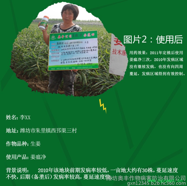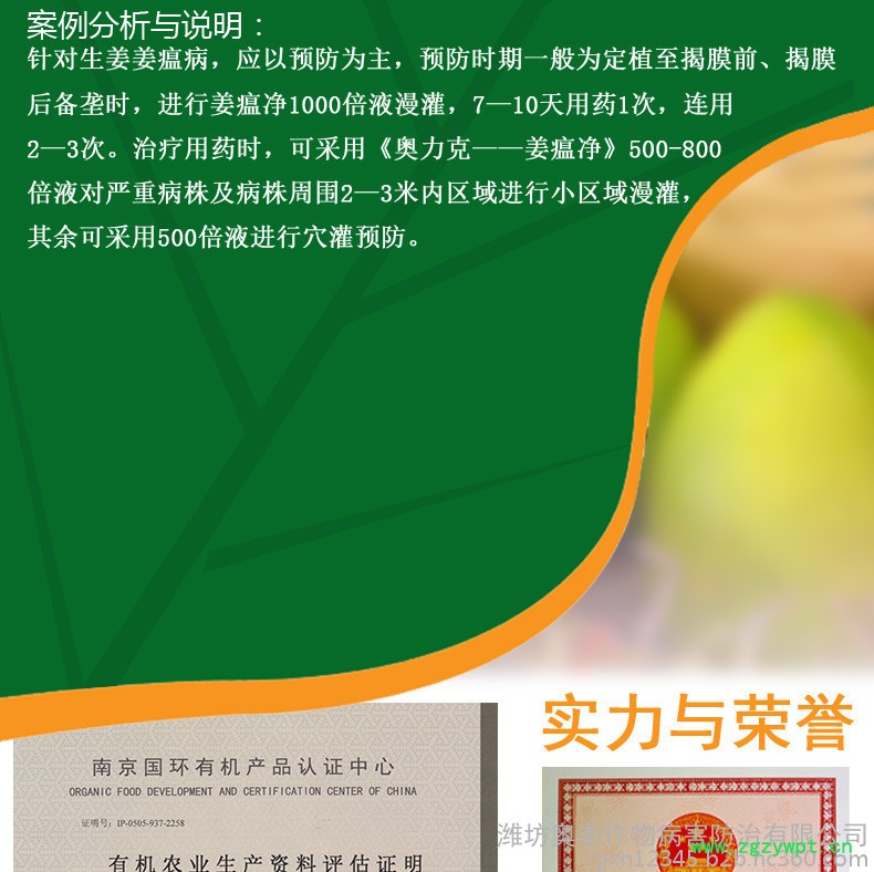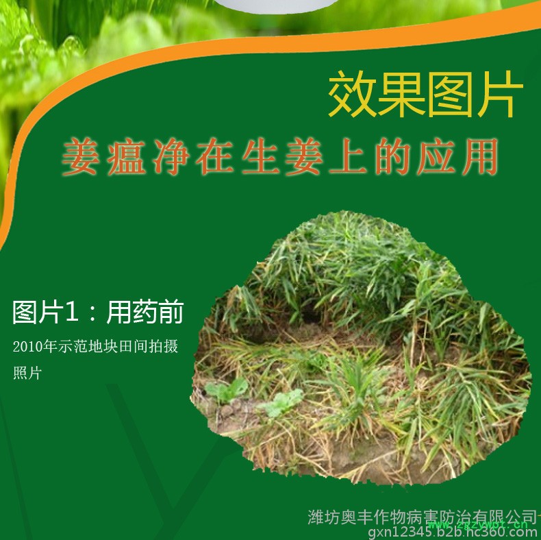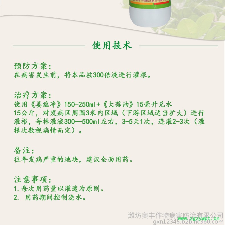 1)农业防治:选择地势高,排水好的地块种植;基肥以腐熟的有机肥为主;发现病姜后及时拔除,带出田外深埋;出现病株后,杜绝漫灌,串灌,以喷灌,浅水沟灌为宜。