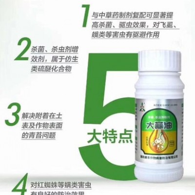 大蒜油:仿生类硫醚化合物,真细菌通杀,内吸强(与中药杀菌剂等复配能提高其药效),其气味对空气中病菌孢子有直接杀灭作用,对粉虱、蛾类等害虫有驱避作用。