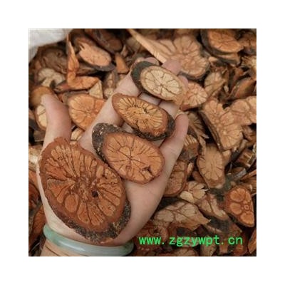【药材性状】大小均有,厚约5毫米。本品呈圆柱形,稍扭曲。表面粗糙,灰棕色或灰褐色,具不规则皱沟纹。质坚实,难折断,切断面皮部棕红色,木部浅棕色,有2-4圈深棕红色环纹,习称鸡眼圈纹,针孔状导管细而密。气无,味微涩。