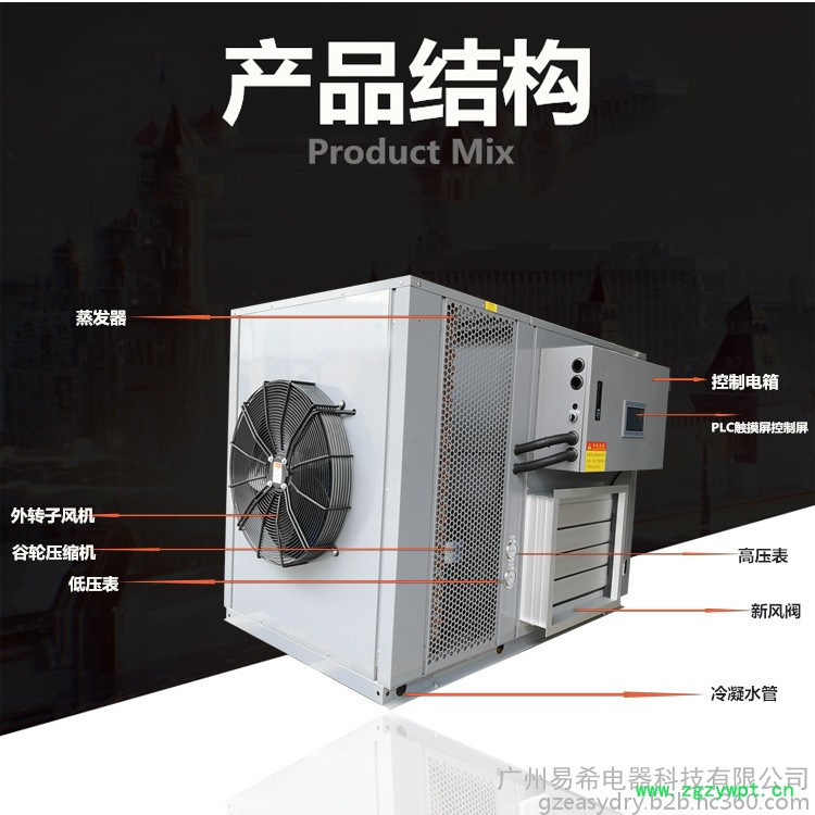 依靠电能吸收空气中的免费热量并将其转移到烘干房内(输入1度电能量能产生4度电热能),实现烘干房温度提高,配合相应的除湿设备实现物料的干燥。