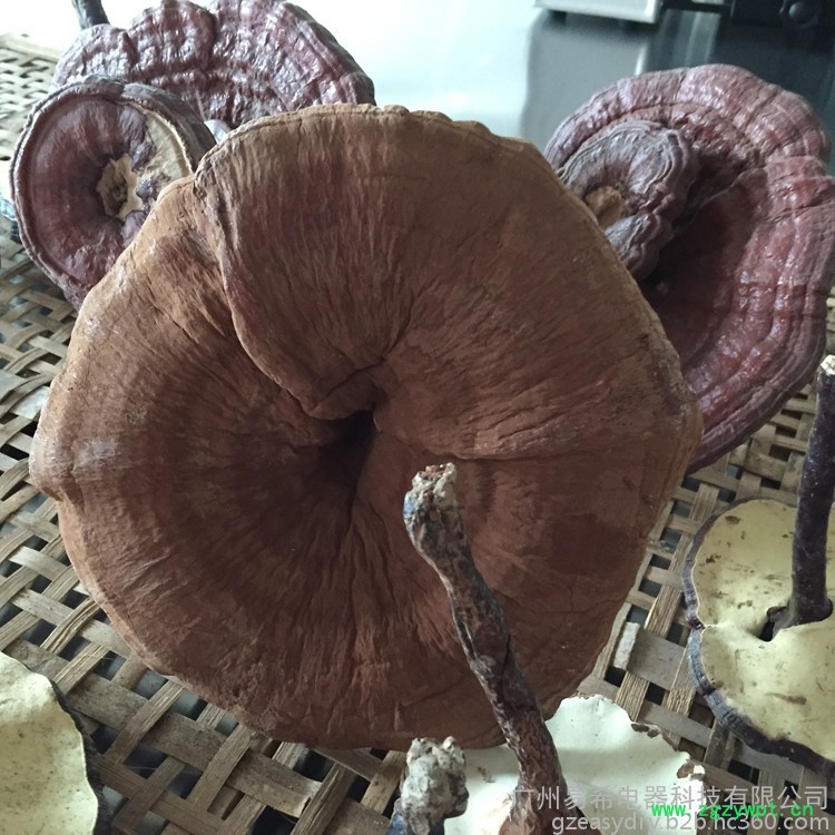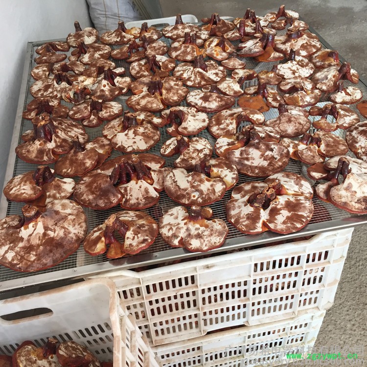 3、将灵芝烘干机的温度设置为中高温脱水干燥2-3小时,然后在60-70℃温度下脱水干燥8-12小时。整个灵芝烘干过程应一次完成,避免中间有间断。直至灵芝干燥至菌盖坚硬,含水量低于13%时结束,即可完成脱水干燥。若未完全干燥便终止干燥,灵芝易生霉、受虫蛀,且卖价很低;相反,如果过度干燥,则干芝生产率低,容易破碎良品率低。