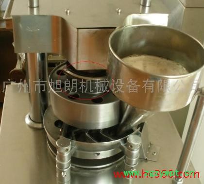 旭朗压片机压片工艺流程包括过量填充、定量、预压、主压成型,出片等工序。本机上层的模孔中装入上冲杆,中层装中模,下层模孔中装下冲杆。由传动部件带来的动力使转台旋转,在转台旋转的同时,上下冲杆沿着固定的轨道作有规律的上下运动,从而完成压片过程。本机可连续加料、连续出片。
