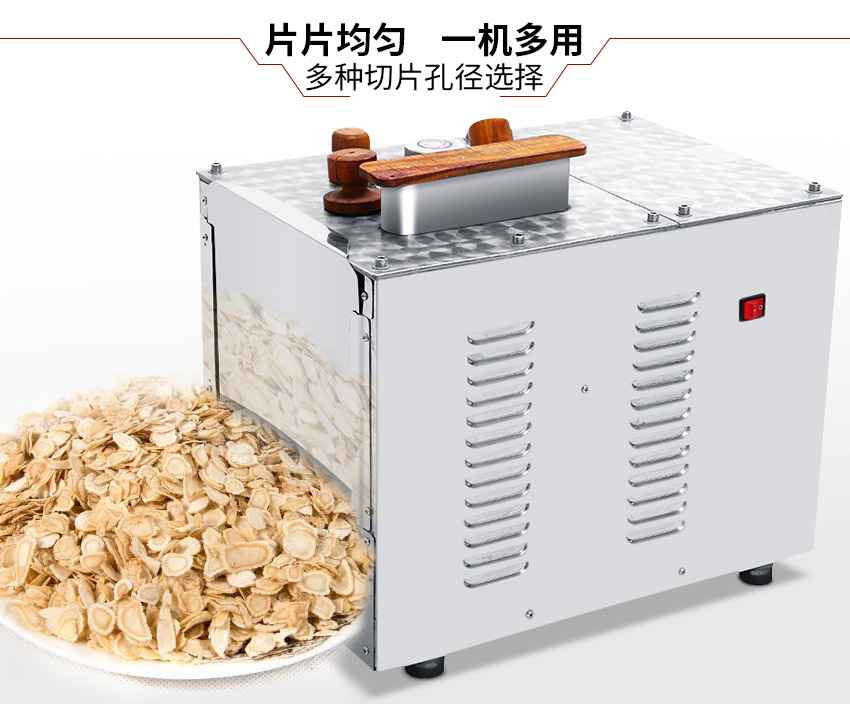 本机选用单相电机配套,采用**轴承,并安装把刀片在刀盘上,速比慢而切片功效高,切片厚薄可以调节,广泛适用于中药房、药店、中药加工场等。本机具有体积少、效率高、操作简便、精巧美观,既省电又安全等特点。