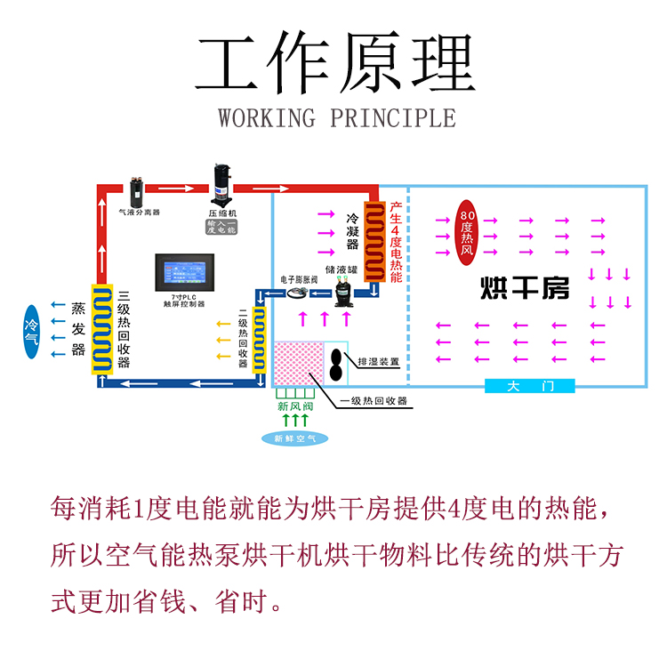 空气能热泵烘干除湿机(热泵烘干机利用输入很少的电能吸收空气中的免费热量,用来烘干物料)