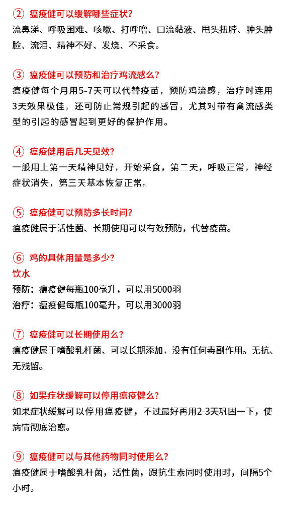 饮水:预防10000羽成禽/瓶,治疗5000羽成禽/瓶,集中3-4小时饮。