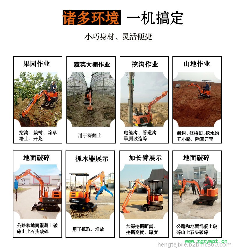 小型挖掘机应用于果园苗圃、园林绿化、山地开荒、农田改造、开挖自来水机电缆管道、室内拆除、地面破碎、蔬菜大棚、养殖场、矿井及隧道施工、河道清淤等农林牧业种植、小型土方工程、市政工程的作业环境。