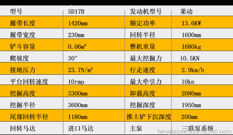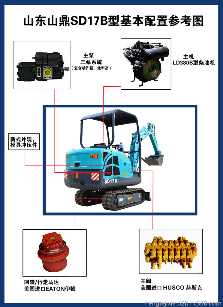 山鼎SD17B小型挖掘机配置:动力系统/莱动380机器(20马力,每小时耗油8元左右);液压系统/中美合资HUSCO多路阀、中美合资 EATON 回转和行走马达 、操纵杆简单等。另:带侧摆,流线型大小臂设计,新式覆盖件便于良好散热,带隔音隔热棉等……