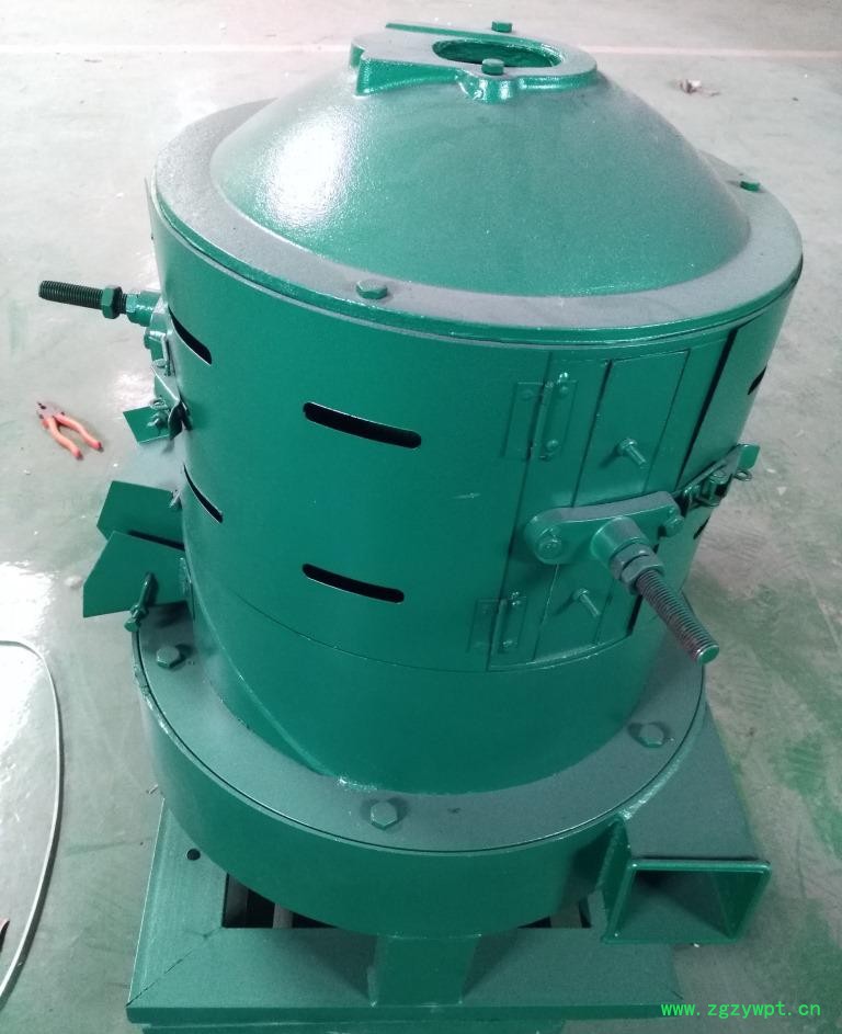 粮食从料斗经插板在重力作用下均匀的流到集体内旋转的砂轮盖板上,有推粮翅甩到机体内圆锥面与砂轮间的碾白室中,在碾白室内由砂轮的研削,壳糠与米脱离,壳糠一部。