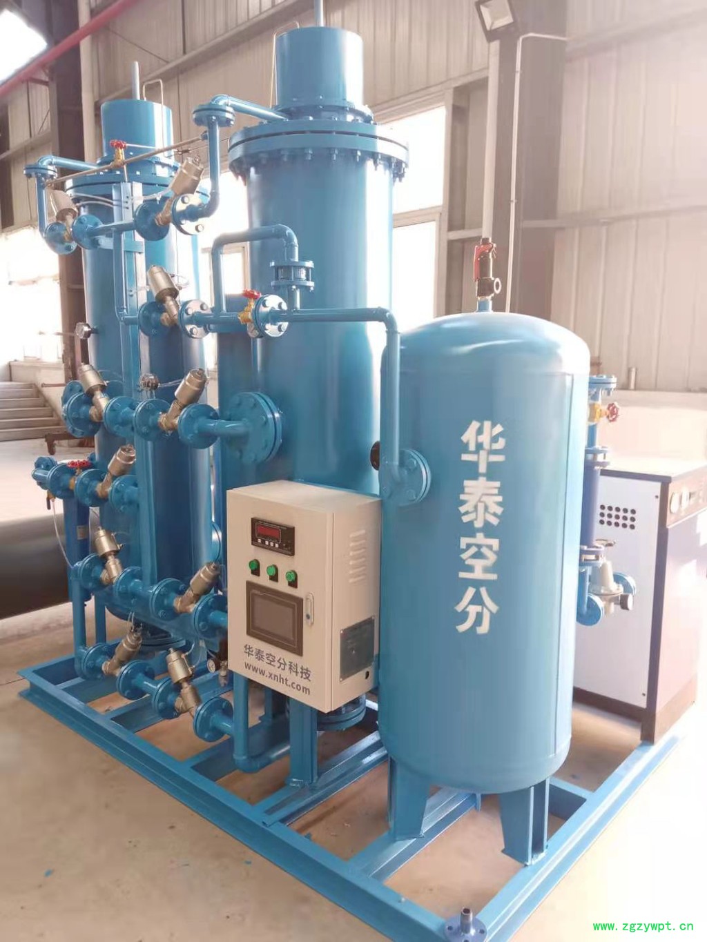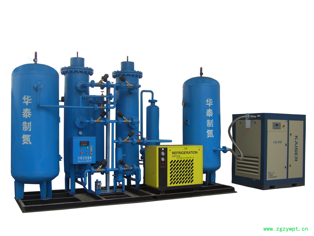 变压吸附制氮设备是采用碳分子筛作为吸附剂,在一定的压力下,利用空气中的氧、氮在碳分子筛孔隙中扩散速率不同而达到分离空气的目的。即碳分子筛对氧的扩散吸附远大于氮,通过可编程序控制器来控制多个阀门的导通、关闭,达到两只吸附塔的交替循环工作:加压吸附,减压脱附的过程,从而完成氧、氮的分离,得到用户所需纯度的氮气。