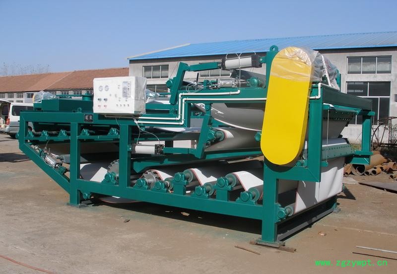 带式压滤机的工作原理是将含水污泥通过料斗进入带式压滤机的滤带,并通过滤带送入滚轮,通过滤带和滚轮的挤压将污泥内的水分挤出形成泥饼。