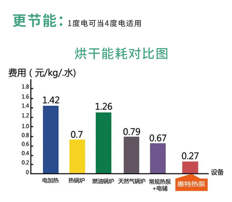 1. 干燥过程排出去的只有水,几乎没有能量流失,能量基本完全回收,因此效率非常高,是传统开环干燥方式的几倍;