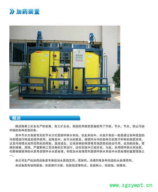 加药装置开发生产的一款自动加药产品,主要用于电厂的锅炉给水、循环水、加联氨、磷酸盐等处理,也可用于石油、化工、环保、供水系统等行业。单元组合式加药装置,主要有溶液箱、计量泵、过滤器、安全阀、止回阀、压力表、缓冲罐、液位计、控制柜等组成一体化安装在一个底座上。用户只需将组合式加药装置安放在加药间,将进水口、出药口接好并接通电源即可启动投入运行,这种工厂化的整套装置,可大大减少设计和现场施工的工作量,对整机系统的质量、安全和现场投运提供了可靠的保证。