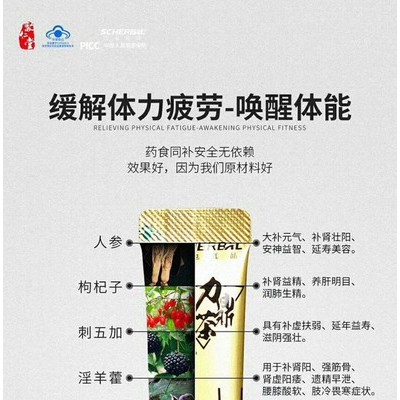| 原料与配料 | 人参、马鹿茸、枸杞子、淫羊藿、刺五加、牛磺酸、绿茶 |