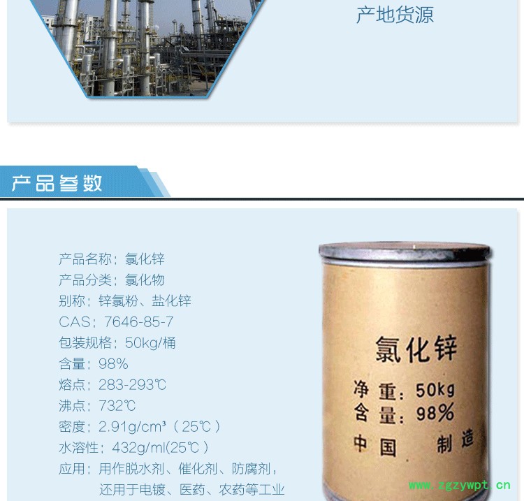 无极功业作为生产活性炭的活化剂,使活性炭成为多孔性物,增大其表面积。也用于制造抗溶性泡沫灭火液的原料有机工业用作聚丙烯腈的溶剂,有机合成的接触剂、脱水剂、缩合剂、去臭剂,特种表面活化剂及用于香兰素、兔耳草醛、消炎痛药物、阳离子交换树脂生产的催化剂。石油工业有做净化剂。染料工业用作冰染染料显色盐的稳定剂,也用于活性染料、阳离子染料的生产。橡胶工业用作硫化促进剂zPC的辅助材料。印染工业用作冰染染料显色盐的稳定剂,也用于活性染料,阳离子染料的生产。橡胶工业用作硫化促进剂zPC的辅助材料,印染工业用作媒染剂、丝光剂、增重剂。电镀工业用作胺盐镀锌的锌离子添加剂。颜料工业用作白色颜料原料。冶金工业用于生产铝合金和处理金属表面。焊接时作为除锈剂。选煤厂常用于做浮沉实验。
