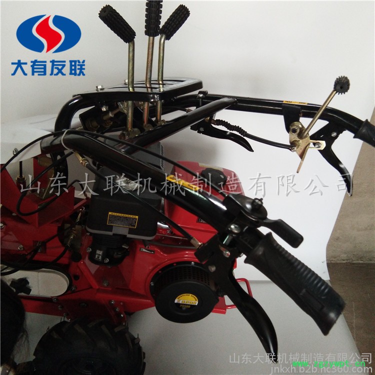 本机器包括机架、可调高低扶手,机架上设有(风冷或水冷)柴油机或汽油机、机架和扶手上设置有变速箱,变速箱的输出轴上设置有能够沿轴移动的驱动轮或链轨.传动方式主要有:全齿轮传动、皮带传动、链条传动三种传动方式.该机具有重量轻,油耗低、相对功率大,结构紧凑、机动性强、操纵轻便灵活的特点。可爬坡、越埂、阶梯性强。广泛适用于平原、山区、丘陵的旱地、水田、果园、菜地、烟地的深旋耕、浅旋耕、犁耕。配上相应机具可进行旱地旋耕、水田旋耕、抽水、开沟、喷淋、喷药除草碎土等作业,还可牵引拖车进行短途运输,是大中型农机无法**的多功能田园管理机,工作稳定可靠、使用寿命长、维修方便等特点。是进入农民家庭很理想的田园管理机。