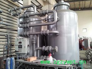 由吸附塔、压紧装置、附属阀门及仪表电器组成。采用复合床结构设计的吸附塔分A、B两塔,塔内填装进口碳分子筛(采用伸展扭转式振动填充法使碳分子筛装填更加均以)。洁净的压缩空气首先从A塔入口端经碳分子筛向出口端流动,此时O2、 CO2、H2O被其吸附,产品氮气由吸附塔出口端流出。经一段时间后,A塔内的碳分子筛吸附达到饱和前自动停止吸附,洁净的压缩空气流入B塔进行吸氧产氮,并对A塔分子筛进行再生。分子筛的再生是通过将吸附塔迅速下降至常压脱附的O2、 CO2、H2O来实现的。两塔交替进行吸附塔再生,即完成氧氮分离,连续产出氮气。