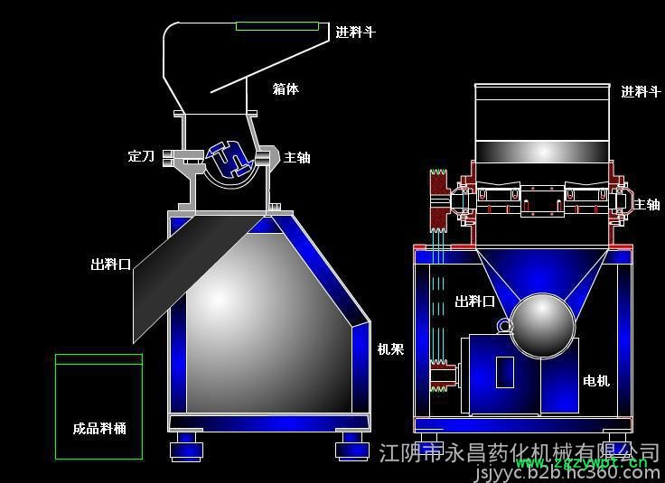 工作原理:物料由进料斗送粉碎室,经刀刃和刀座的冲击,卧式旋转刀和卧式固定刀同时剪切粉碎,由于受到旋转离心力的作用,物料自动流向出口处。