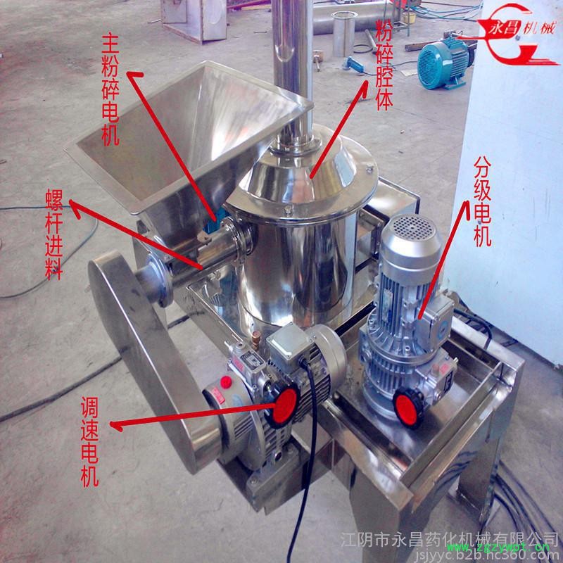 本机由主机、辅机、电控箱三个部分组成,具有风选式、无筛、无网、粒度大小均匀等多种性能,生产过程连续进行。该机在粉碎作业时主机不升温,可粉碎各种热敏性物料。其综合性能已达到国际先进水平,该机广泛运用于食品、化工、制药、饲料、碳酸钙、植物纤维、染料、农药等低硬度物料的超细粉碎。