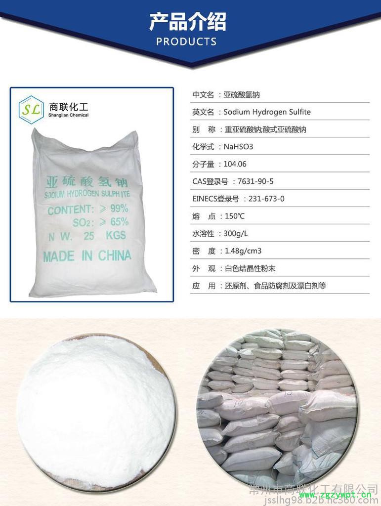 亚硫酸氢钠,白色结晶性粉末。有二氧化硫的气味,具不愉快味。暴露空气中失去部分二氧化硫,同时氧化成硫酸盐。溶于3.5份冷水、2份沸水、约70份乙醇,其水溶液呈酸性。