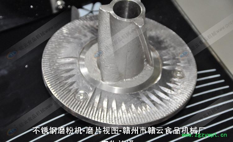 四.磨粉机的操作与调整 1. 打开前端盖,将动磨片. 弹簧.顶轴.轴承.等安装 2.将料斗插入壳盖入料口。在磨粉时,应注意进料量,调节插板,以免进料太快,卡死电机。 3. 为防止静磨片旋转.松动.应用螺钉将其固定在磨粉腔内。 4. 磨粉时。物料需干燥,不得用湿料,否则会粘住磨片,不出料。 5. 磨片的工作间隙必须根据料所需的粗细而进行调整,调整时先松开调节螺母,粗细靠调节螺丝进行调整,调整适当后,将调节螺母拧紧。 6.动磨片的调整,取下动磨片,松开磨片上三个螺钉,取下弹簧后,将动磨片装回连轴器,然后调节磨片,直到与静磨片重合。五.注意事项 1.每次开机前,应检查静磨片.动磨片和进料斗紧固螺钉是否松动,并加以拧紧。 2.每次用机结束后,应将机器内部清理干净,并通风晾干。 3. 如发现机器零件有严重磨损或损坏时应及时进得行修理或更换。 4。 机器较长时间不用时,机器勿倒置,请水平放置,并切断电源。 5.机器应水平安装在工作台上。 6. 机器启动后,应待运转正常时才能放料加工,注意进料量防止电机超载卡机。 7.在加工过程中,如因停机等原因突然停电,必须清除磨粉腔内物料才能再启动。 8.加工五谷粮。中药材时需烘干,清除石块.金属片等杂物。 六. 产品细节图