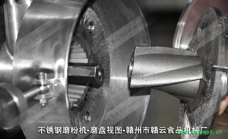 四.磨粉机的操作与调整 1. 打开前端盖,将动磨片. 弹簧.顶轴.轴承.等安装 2.将料斗插入壳盖入料口。在磨粉时,应注意进料量,调节插板,以免进料太快,卡死电机。 3. 为防止静磨片旋转.松动.应用螺钉将其固定在磨粉腔内。 4. 磨粉时。物料需干燥,不得用湿料,否则会粘住磨片,不出料。 5. 磨片的工作间隙必须根据料所需的粗细而进行调整,调整时先松开调节螺母,粗细靠调节螺丝进行调整,调整适当后,将调节螺母拧紧。 6.动磨片的调整,取下动磨片,松开磨片上三个螺钉,取下弹簧后,将动磨片装回连轴器,然后调节磨片,直到与静磨片重合。五.注意事项 1.每次开机前,应检查静磨片.动磨片和进料斗紧固螺钉是否松动,并加以拧紧。 2.每次用机结束后,应将机器内部清理干净,并通风晾干。 3. 如发现机器零件有严重磨损或损坏时应及时进得行修理或更换。 4。 机器较长时间不用时,机器勿倒置,请水平放置,并切断电源。 5.机器应水平安装在工作台上。 6. 机器启动后,应待运转正常时才能放料加工,注意进料量防止电机超载卡机。 7.在加工过程中,如因停机等原因突然停电,必须清除磨粉腔内物料才能再启动。 8.加工五谷粮。中药材时需烘干,清除石块.金属片等杂物。 六. 产品细节图