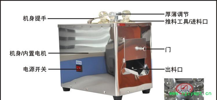 本机选用单相电机配套,采用**轴承,并安装四把刀片在刀盘上,速比慢而切片功效高,切片厚薄可以调节,广泛适用于中药房、药店、中药加工场等。本机具有体积少、效率高、操作简便、精巧美观,即省电又安全等特点。