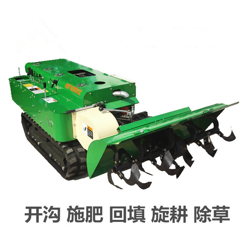 多功能 履带式开沟施肥机安装上不同的配件可以进行单独旋耕、回填、单独开沟、施肥、也可混合搭配使用。产品结实耐用,性能优越,操作方便.耐用:机身加厚,密,履带式行走,可进行原地转向。刀具都是加厚75号猛钢锻造,非常耐磨耐用,工作效率高.
