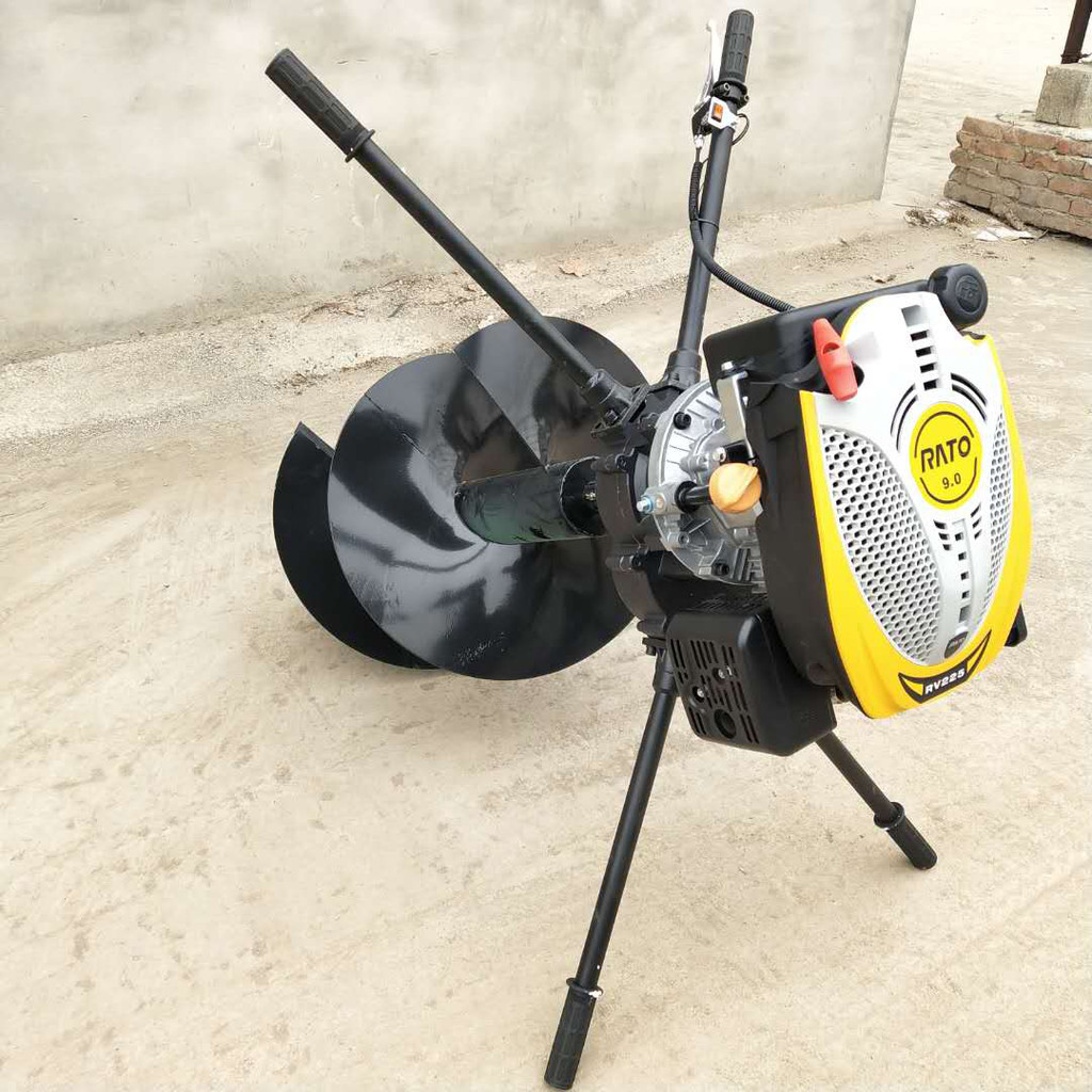 (2)使钻头对准待挖坑的标记中心,按下工作开关,发动机带动钻头旋转入土;钻头切去中心部分土壤,进而钻头叶片下端的刀片切削土壤,切下的土壤在离心力作用下被抛向穴壁并在磨擦力作用下沿着螺旋叶片向上升到地面并被抛撒到穴坑的周围;