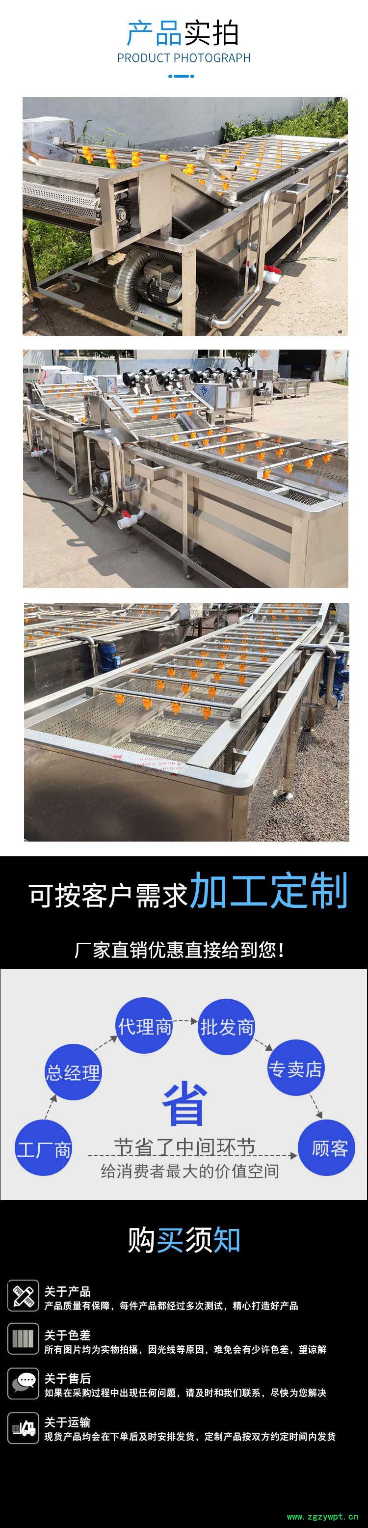 该设备由减速机、水泵、滚筒、支架、托轮、喷淋水管、料斗、盖板、水箱、阀门、传动轴、电机架、电气控制开关等一些零部件组成。通过链条由电机链轮带动长轴上链轮,再由过渡轴的链轮和滚筒上的不锈钢链条啮合而使滚筒实现转动。物料进入滚筒后通过喷淋管冲洗以及滚筒翻转滚动达到清洗效果,滚筒下方有水箱,靠近进料的清水水箱,进水管接清水,靠近出料边有污水排出口。