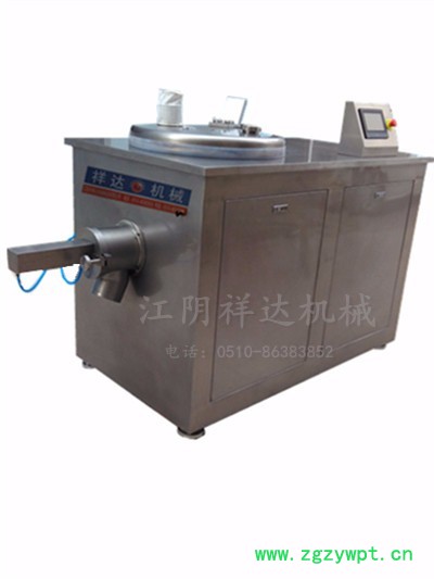 湿法混合制粒机工作原理: 高效湿法混合制粒机将粉体物料与粘合剂在圆筒形或锥形容器中,由底部混合桨充分混合成湿润软材,然后由侧置的高速粉碎桨切割成均匀的湿颗粒。工作时将几种配方的物料一次性加入工作容器,经搅拌混合后注入粘合剂 ,或一种配方的物料与粘合剂一次性加入工作容器,由搅拌桨混合制成软材后,切割绞刀将软材绞碎成粒。高效湿法混合制粒机中带动绞刀的均为双速电机,因而控制粘合剂的溶度、绞刀转速、绞碎时间便可获得不同粒度的颗粒,生产药品在批与批之间,其粒度分布、密度、流动性等方面质量达到较高的重复水平按同一程序自动生产,确保产品的制粒质量。